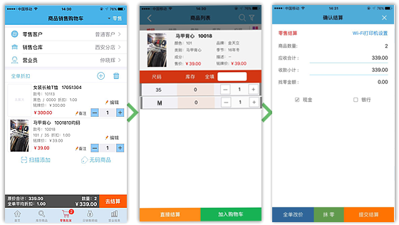 可通過輸入或掃描條碼加入商品到購物車結算,前臺收銀支持批發、零售,支持客戶新增和查詢.