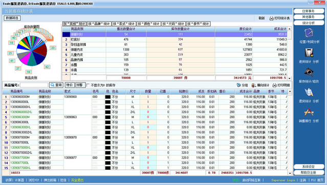 按類別,按顏色,按尺碼,按品牌統計庫存數據,并可 設置預警庫存,實時分析和庫存詳細情況顯示。在庫存統計界面中,可以方便的對 庫存信息進行實時調整。