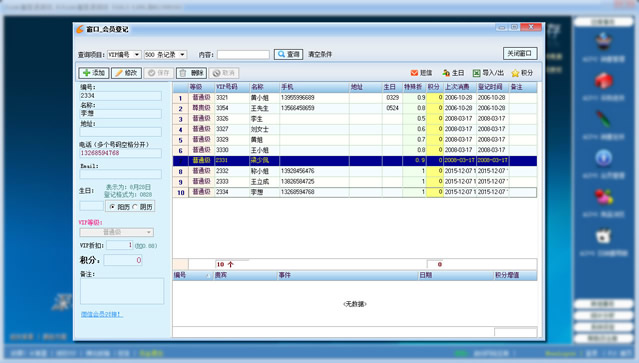 本系統支持會員與會員積分管理。 會員資料管理:登記會員的電話以及生日等基本信息。 積分管理 :可設置消費多少元積一分。積分還支持換購等功能。其他功能包括:生日提醒及祝福短信發送等。