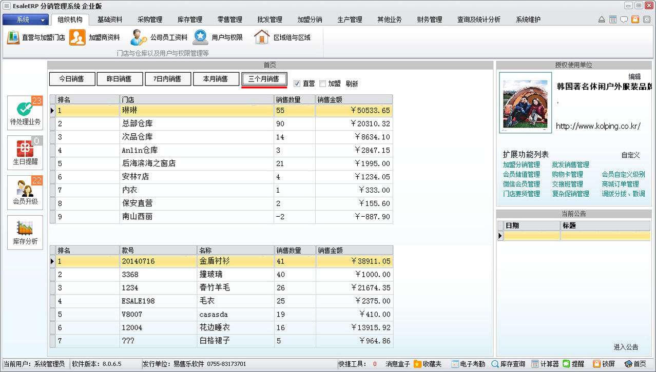 有清晰的店面銷售和商品款號(hào)銷售排行榜展示及明細(xì)數(shù)據(jù),智能化的日常業(yè)務(wù)提醒功能。例:采購(gòu)入庫(kù),調(diào)出,調(diào)入,分銷,會(huì)員升級(jí)等。