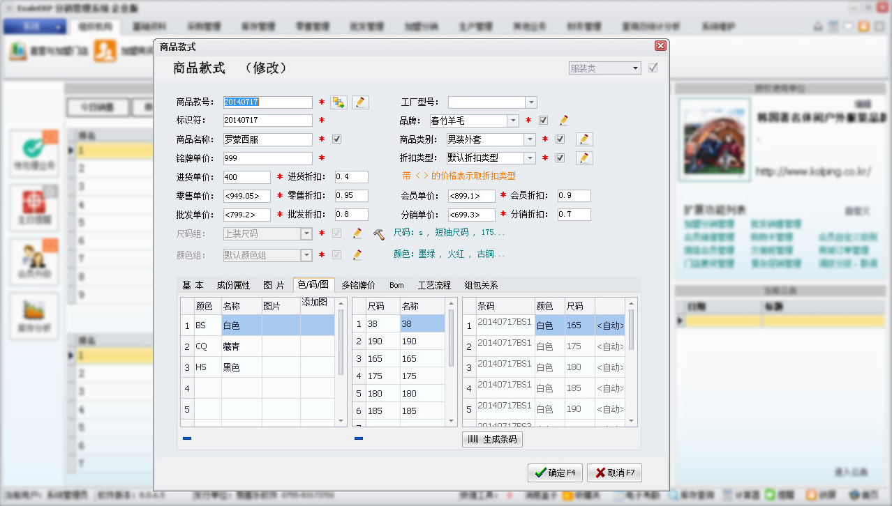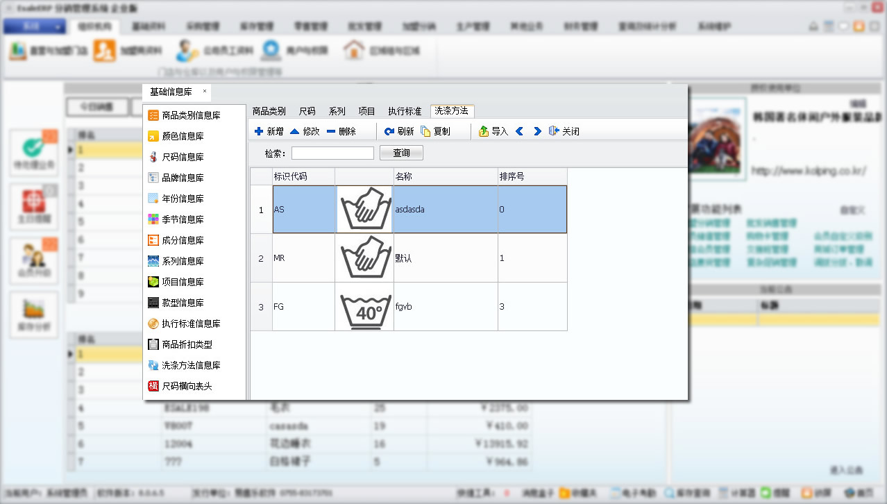 支持顏色、尺碼、品牌、年份、季節(jié)、成分、系列、項(xiàng)目、款型、執(zhí)行標(biāo)準(zhǔn)、商品折扣、洗滌方法等信息庫(kù)管理。