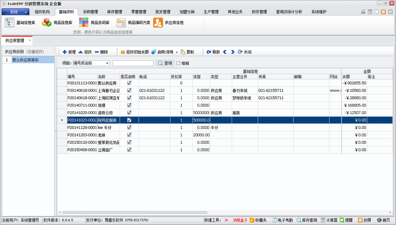 完善的供應(yīng)商資料管理,除了簡(jiǎn)單的名稱、電話、類型、地址等基本資料管理外,增加了供應(yīng)商賬戶信息管理、余額管理以及財(cái)務(wù)對(duì)接等內(nèi)容。