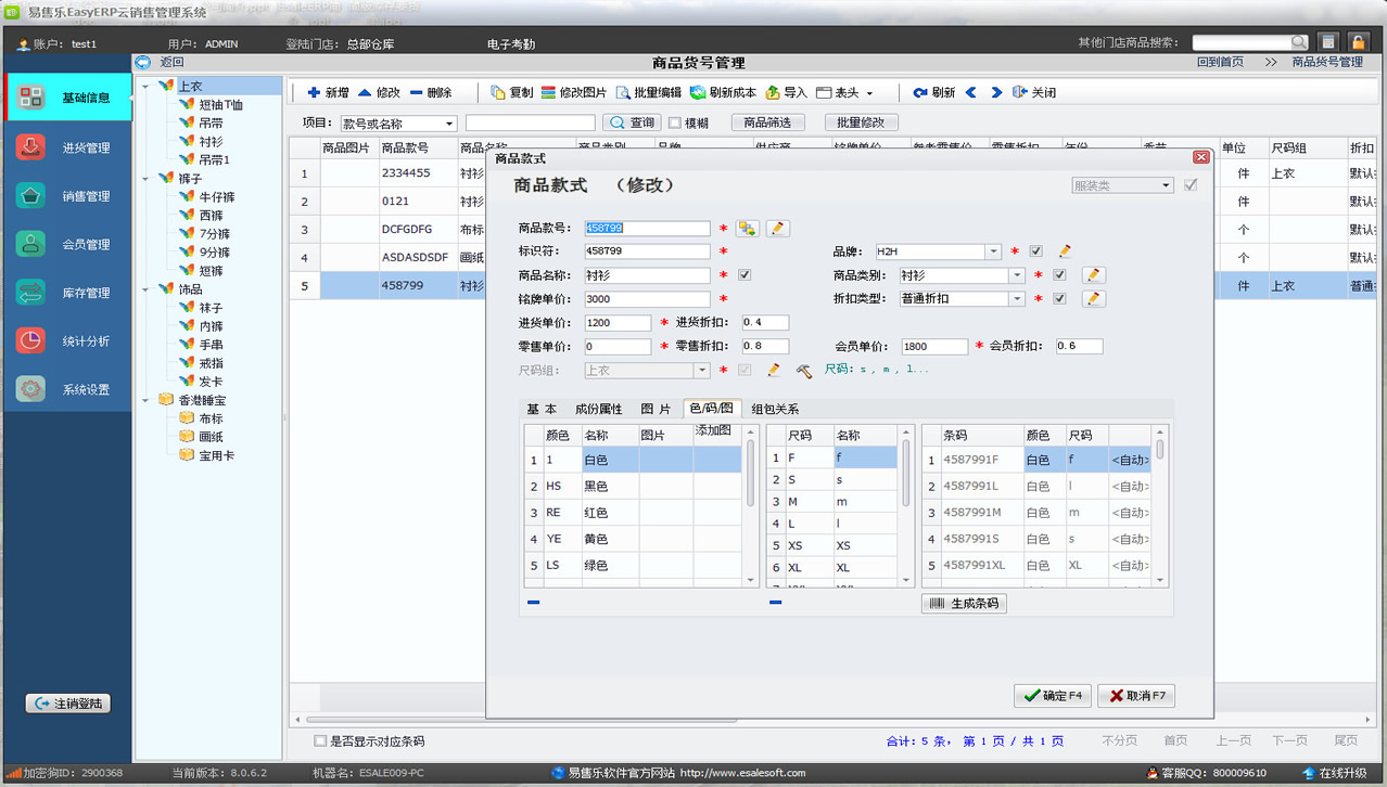 可以管理商品的款號、顏色、尺碼、品牌、類別、季節、折扣、波段、執行標準、洗滌方法、成份、系列、安全級別等商品信息。