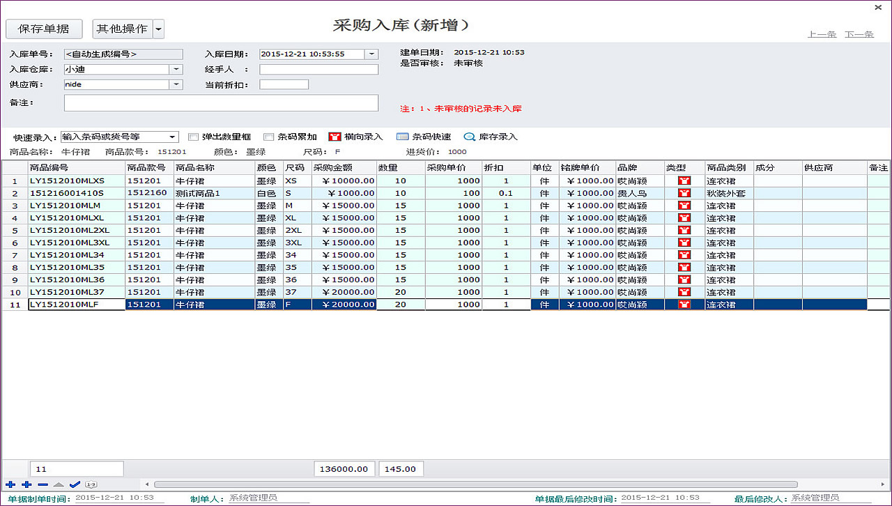 有橫向尺碼錄入模式和縱向條碼掃碼模式以及表格導入三種方法進行入庫,入庫過程方便快捷。入庫中增加供應商管理方便日后賬目管理。