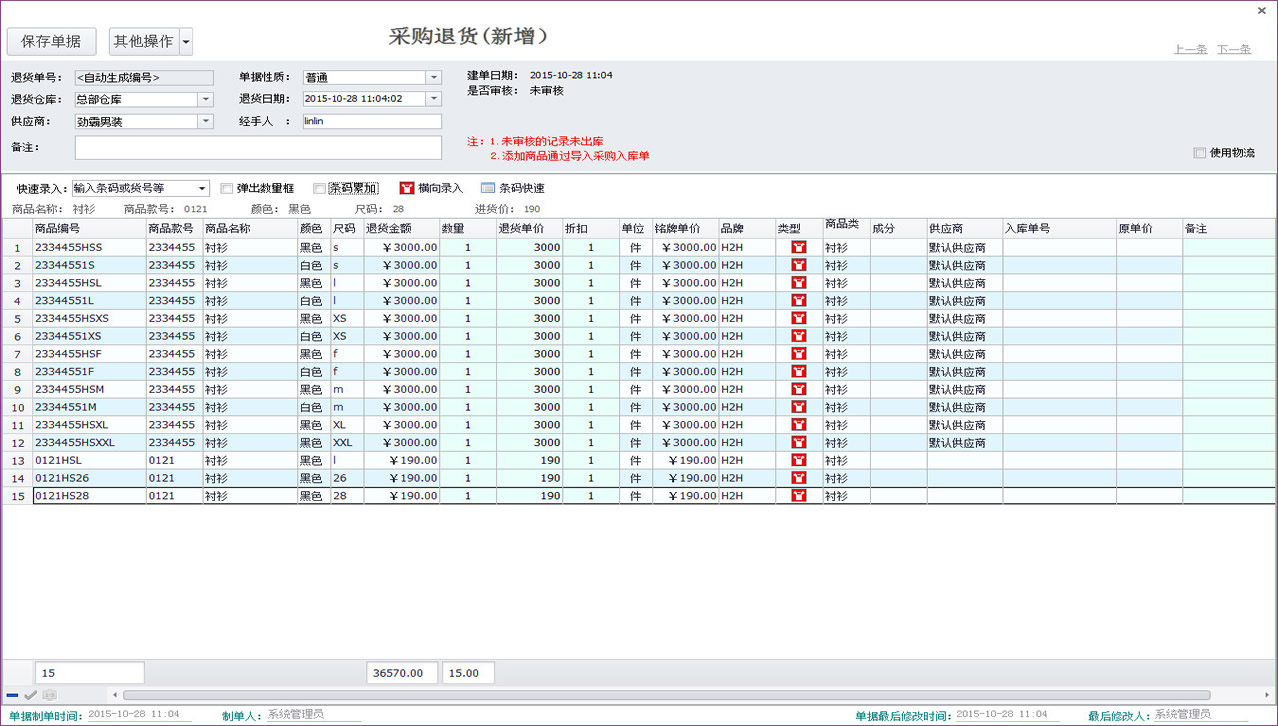 退貨方式的錄入采用了入庫模式的多種錄入方法以外,并增加了通過采購入庫單導入的方式進行退貨,極其方便了退貨工作。