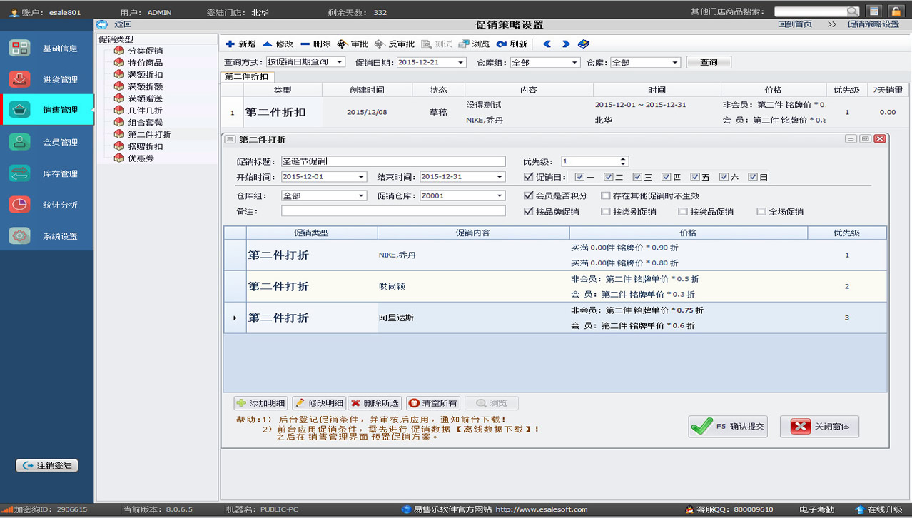 擁有分類促銷、特價商品、滿額折扣、滿額折額、滿額贈送、幾件幾折、組合套餐、第二件打折、搭贈折扣、優惠券等多種促銷策略。