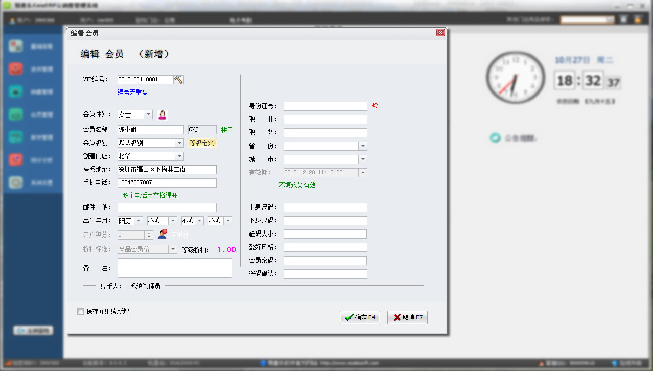 會員實行等級化管理,可以實現異地自動積分并進行累加,增加會員儲值功能。在會員資料管理當中除基本的資料外另增加入了上下身尺碼和愛好及鞋碼大小管理。