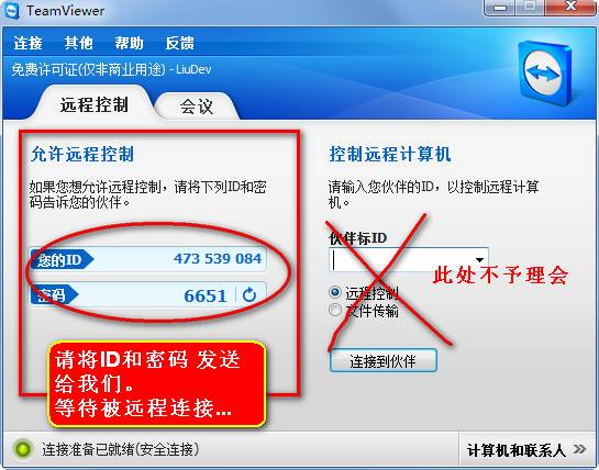3.發(fā)送遠(yuǎn)程ID和密碼給我們,等待被遠(yuǎn)程連接。